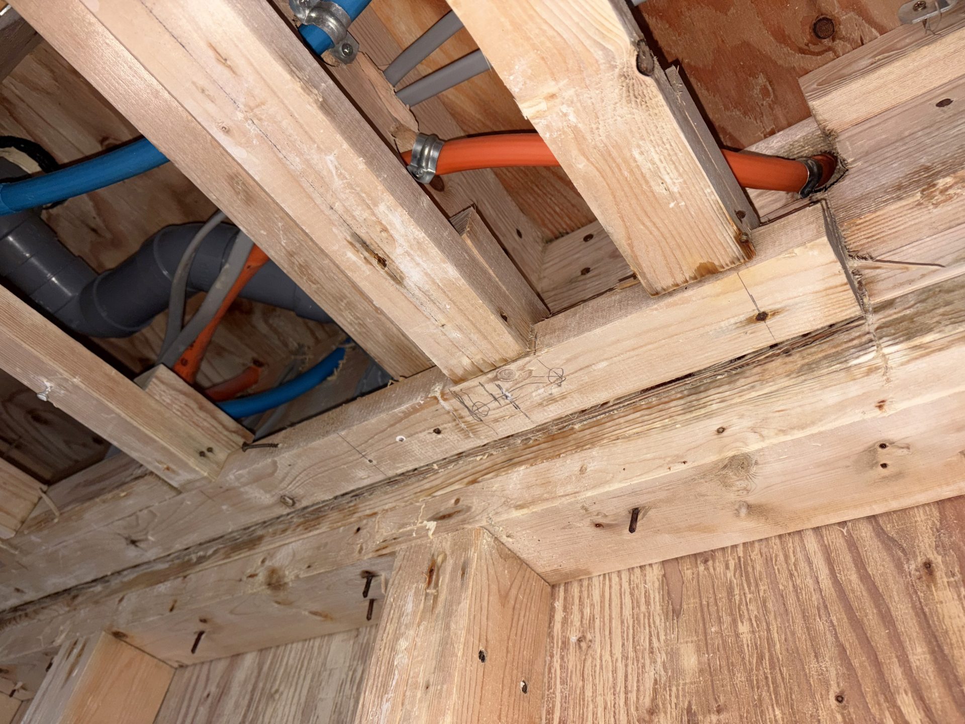 ガレージ内倉庫の天井を剥がしたら、木材に白い付着物が…この正体は??